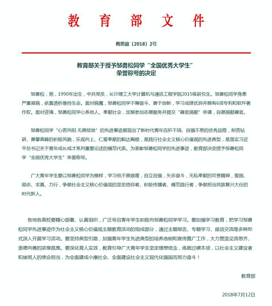日前,教育部印发了《关于授予邹勇松同学“全国优秀大生”荣誉称号的决定》(教思政[2018]2号),表彰邹勇松[“心若向阳无畏绽放”的先进事迹,并授予其“全国优秀大学荣誉称号。
