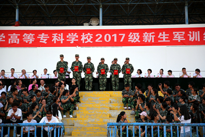 最后,党委书记刘健发表讲话。他充分肯定了2017级新生在军训中吃苦耐劳和坚忍不拔的优良作风,向他们在大学第一堂课——军训中取得的好成绩表示祝贺,向付出辛勤劳动的教官、教师们表示感谢。刘书记以“三位老师”总结了本次军训活动:第一位“老师”是部队的两位教官,他们尽职尽责,无私奉献;第二位“老师”是我校首次承担新生军训任务的43名“学生教官”,他们迎难而上,圆满完成了军训任务;第三位“老师”是同学们自己,大家吃苦耐劳,奋勇争先,为校增光。同时,刘书记希望同学们把军训中收获的责任、情怀、克服困难的勇气和组织纪律观念,带进未来的校园、课堂、餐厅、宿舍之中,融入大家成长过程中的不断思考之中,以自己良好的学风和生活习惯,为今后的大学生活和人生之路打下坚实的基础。