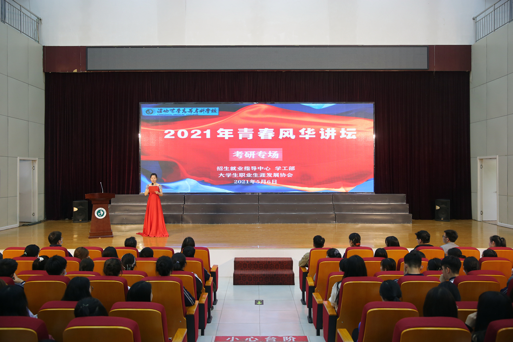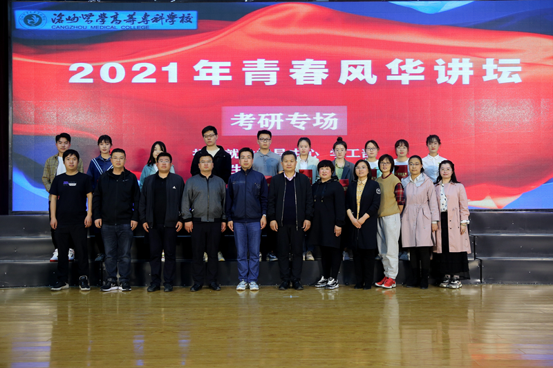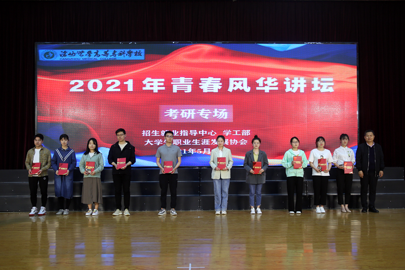 5月6日下午,青春欢快的开场舞《青春畅想》,拉开了我校2021年青春风华讲坛的序幕。为表彰考研先进、树立学习典型,今年我校将考研专场作为青春风华讲坛的第一讲。本次活动由招生就业指导中心和学工部主办、大学生职业生涯发展协会协办。副校长李炳仁、药学系党总支书记王国明、护理系党总支副书记胡艳华、医学系党总支副书记高福来、医学技术系党总支副书记孙浩、招生就业指导中心、学工部和各系教师代表参加了本次活动。