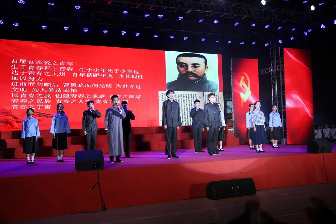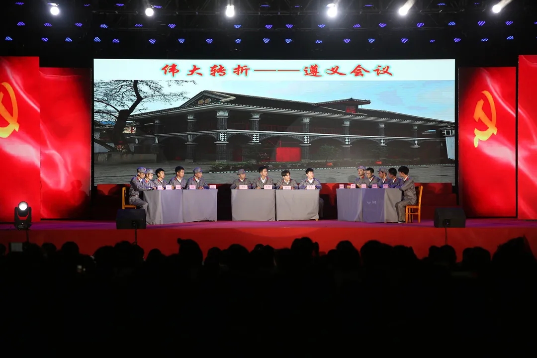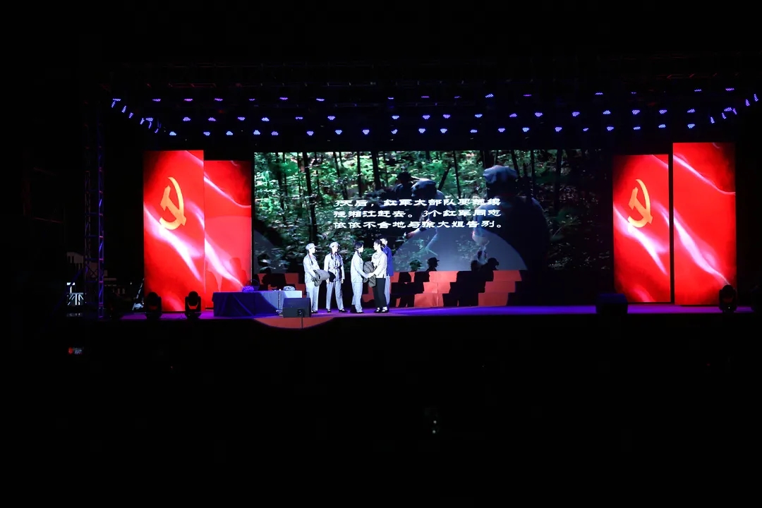 此次教学创新成果展演分为“开天辟地换新天”、“红军不怕远征难”、“全民抗战勇争先”、“天翻地覆慨而慷”、“迈向复兴新时代”五个篇章。情景剧《红船映初心》、《遵义会议》、《古田曙光》,通过对党史重大历史节点的回顾,再次重温党从成立、壮大到战胜挫折、逆境中发展的曲折历程。尤其是在《红船映初心》尾声,现场全体人员切身融入到剧情当中,全体起立,饱含深情地与演员齐声合唱《国际歌》,深刻感受一代代党的前辈崇高的革命理想和坚定的革命信念。党委副书记张中兴带领学校专兼职思政课教师深情朗诵了诗歌《中国梦》,热情讴歌中国共产党一百年来带领全国人民从站起来、到富起来、再到强起来取得的惊天动地的丰功伟绩,畅想中华复兴之梦,坚定在新时代中国特色社会主义道路上奋勇前进的决心!歌曲《映山红》用优美深情的旋律,唱响了人民大众对党为了民族和国家浴血奋斗历程的真诚歌颂。大学生们热情朗诵了毛主席《七律·人民解放军占领南京》等经典诗词,重温了老一代革命先辈的献身革命、百折不屈的钢铁意志和乐观情怀。大家还一同观看了《开国大典》彩色视频,重温了党和国家历史上那个激动人心的时刻。