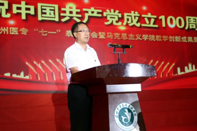 党委书记刘健同志发表讲话,他回顾了我党的百年历史,总结了我校63年来的辉煌历程;他指出,学校正处于从一所普通医学专科学校向高水平卫生职业教育转型的“换挡期”、“十四五”期间升本的关键期和高质发展的加速期,面对新目标、新任务、新挑战,我们唯有时刻牢记党的宗旨,继承光荣传统,以更加广阔的视野、更加饱满的热情、更加务实的态度、更加昂扬的斗志,解放思想、开拓创新、攻坚克难、勇于担当,才能不辜负党组织的期望和广大师生员工的重托,才能无愧于时代、无愧于历史。在中国共产党开启第二个百年奋斗目标新征程的关键时期,让我们在习近平新时代中国特色社会主义思想伟大旗帜下,聚焦立德树人根本任务,勇担使命,为建设特色鲜明高水平医专和本科院校而努力奋斗,为构建和谐美丽幸福医专贡献力量!