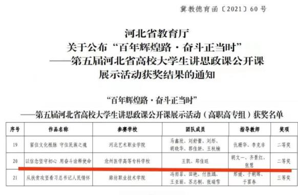 日前,接河北省教育厅《关于公布“百年辉煌路·奋斗正当时”——第五届河北省高校大学生讲思政课公开课展示活动获奖结果》通知,在第五届河北省高校大学生讲思政公开课展示活动中,我校马克思主义学院胡文一、齐景红、张惠三名教师指导的(口腔系19-4班)王凯、郑佳旺团队《以信念坚守初心 用奋斗诠释使命》作品斩获二等奖!