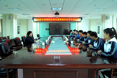 会后,评估专家组在学校领导和马克思主义学院教师的陪同下到马克思主义学院进行现场评估检查。专家组分别对校领导、马克思主义学院负责人、相关职能部门负责人和学生代表开展了深度访谈,召开教师和学生座谈会。同时,参照《河北省高校思想政治理论课质量评估指标体系》审核自查报告及支撑材料,对评估材料逐项查阅,量化评分。随后,专家组分组移步教学楼,随堂听取了四名教师的思想政治理论课现场授课。