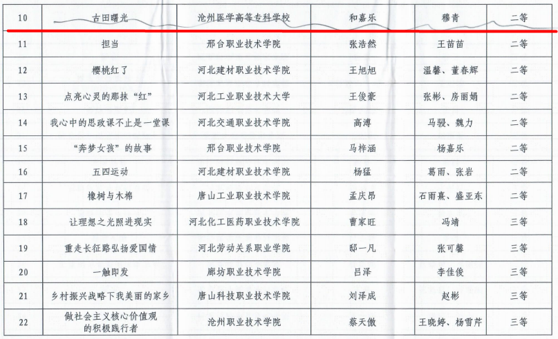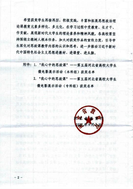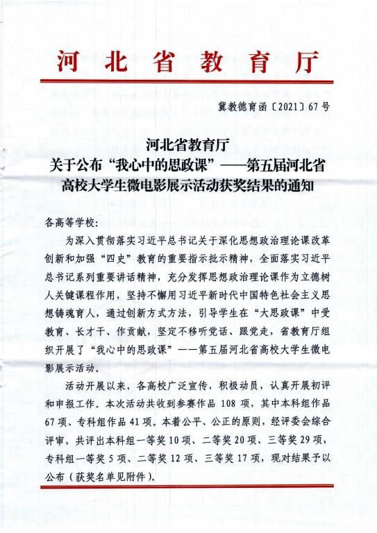 近日,河北省教育厅发布了《关于公布“我心中的思政课”——第五届河北省高校大学生微电影展示活动获奖结果的通知》,本次活动共收到全省各高校申报的108项参赛作品。经评委会综合评审,由我校马克思主义学院段湘君老师指导的《战火中的大学生》、穆青老师指导的《古田曙光》两部作品均获得(专科组)二等奖!