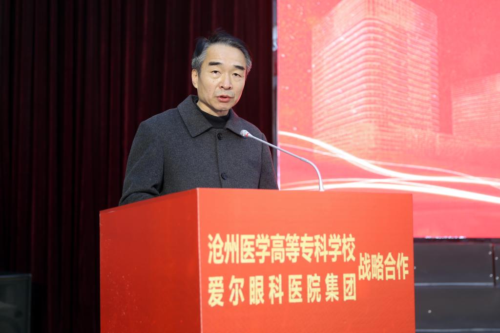 我校党委书记刘健致辞,对莅临参加签约揭牌仪式的各位领导、嘉宾表示欢迎。他简要介绍了学校发展近况,表示沧州医专与爱尔眼科医院集团开展战略合作,成立爱尔产业学院,沧州爱尔眼科医院成为学校附属眼科医院,是我校“校院联姻”的又一“硕果”,开启了校院双方融合发展新征程。他希望双方实现优势互补,开展全方位深度合作,为培养适应社会与市场需求的高素质技术技能型人才共同努力。