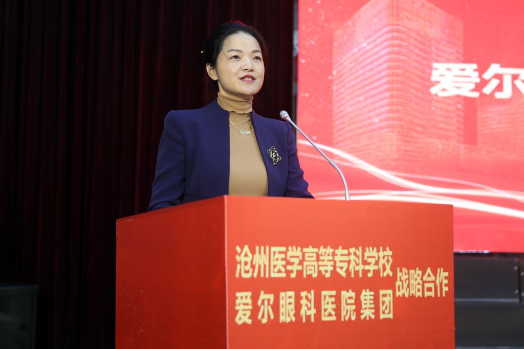爱尔眼科医院集团校企合作总监、人资中心副总监罗芬代表爱尔眼科医院集团介绍了集团的全球布局、医疗学术、教育科研、发展战略、合作办学等方面的情况,希望能与我校在实习实训、教学科研、科技创新、人才培养等方面达成合作,共同为医疗产业培养德技双馨的应用型人才。