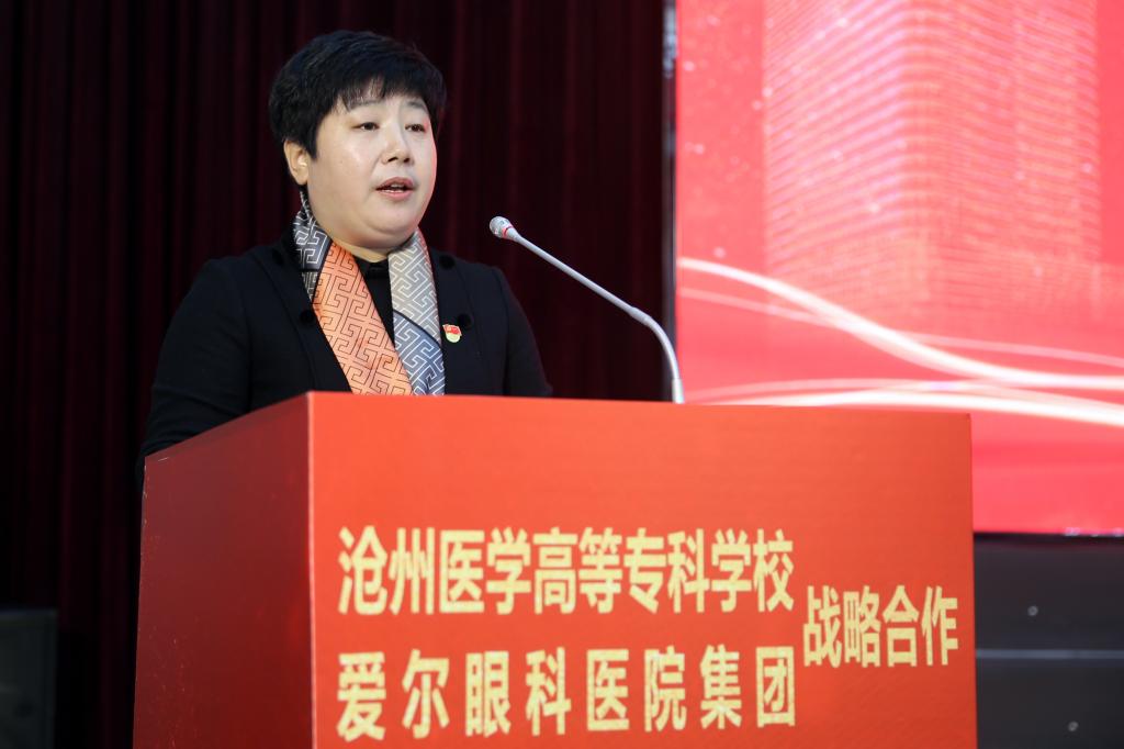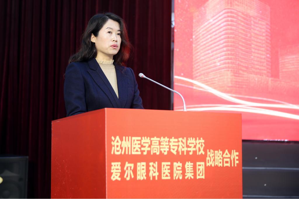 沧州市卫健委主任王永梅指出,沧州爱尔眼科医院成为沧州医专附属眼科医院,对深化沧州市医疗体制改革,加强医教协同,加快地方医疗卫生事业发展起到了积极的推动作用。她希望沧州医专以附属眼科医院建立为契机,促进优质医疗资源共建共享,树立品牌,建设特色眼科专科;爱尔眼科医院要抓住机遇,锐意开拓,以舒适的环境、一流的服务、良好的信誉、精湛的技术,提供更好的医疗服务;沧州医专附属眼科医院成立后要更好地服务于地方医疗行业和教育事业,为建设健康河北、健康沧州作出积极贡献。