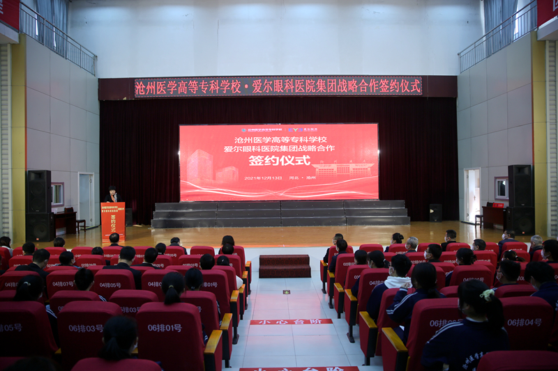12月13日上午,我校与爱尔眼科医院集团战略合作签约仪式在第一学术报告厅隆重举行。沧州市卫健委主任王永梅、副主任付立才,沧州市教育局副局长胡同发、高职成教科副科长高健,爱尔医疗投资集团总裁助理、校企合作总经理谌兵,校企合作总监、人资中心副总监罗芬等12名领导,我校党委书记刘健,校长才晓茹,副校长王衍共同出席签约仪式。教务处、医学技术系和医学系副科级以上干部、教师和学生代表共计100余人参加了签约仪式。仪式由校长才晓茹主持。