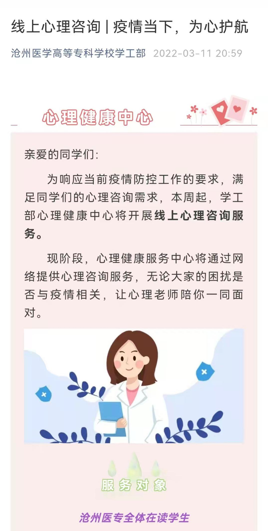线上疏导为心护航。为缓解疫情对学生心理健康的干扰,学校把为学生提供心理危机的干预和服务作为当前疫情防控的一项重要工作,心理健康中心面向全校学生开展线上心理咨询服务,通过谈心疏导、人文关怀,舒缓学生心理压力,鼓励学生用健康的心态和昂扬的斗志决胜战“疫”。