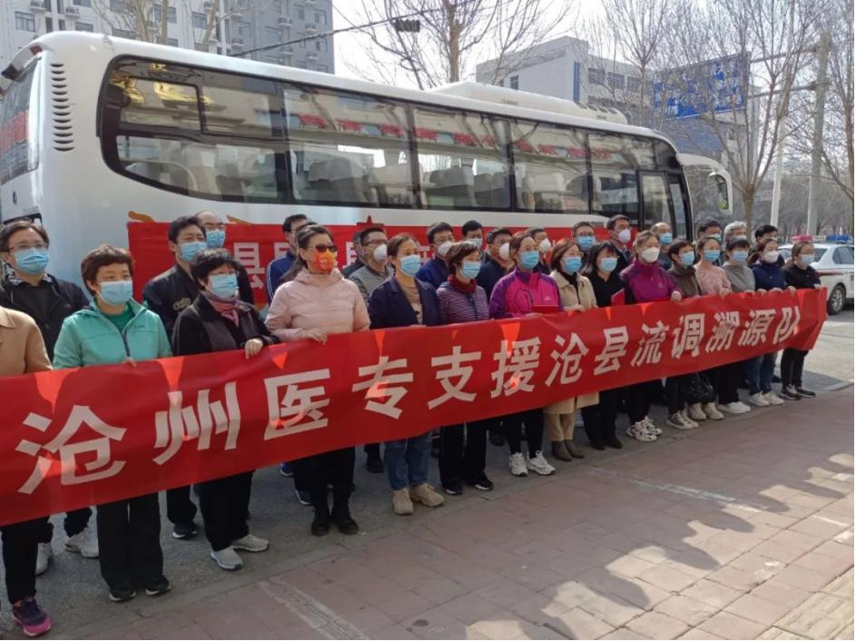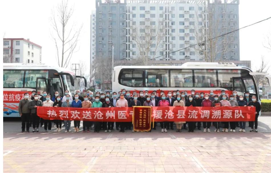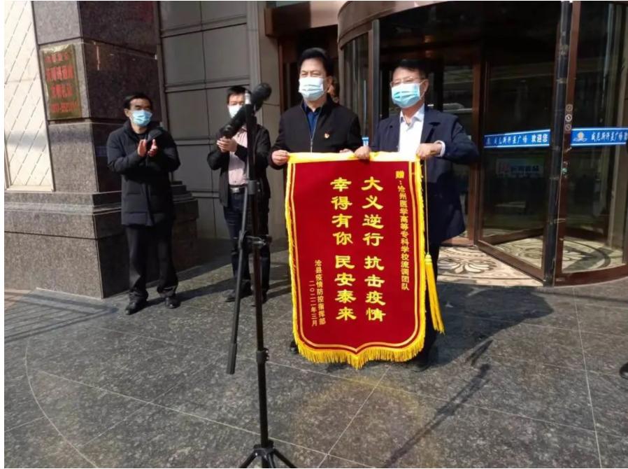 2022年3月23日下午,沧县县委、县政府举行欢送仪式,欢送我校支援沧县流调队全体队员。沧县县委副书记、县长穆春江向流调队赠送锦旗,并代表沧县74万人民表达了对沧州医专流调队诚挚的谢意,党委副书记张中兴代表学校对沧县县委、县政府及相关部门对我校在沧县开展流调工作期间给予的支持和协助表示感谢,并表达了并肩前行、携手抗疫,成功夺取疫情防控最终胜利的决心和信心。欢送仪式结束后,沧县县委、县政府派出警车、摩托车队护送我校支援沧县流调队返程。