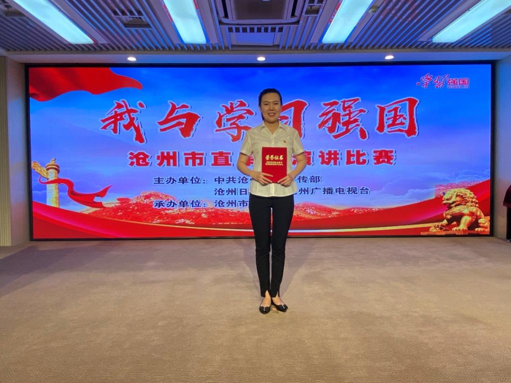 6月9日下午,由中共沧州市委宣传部、沧州日报社、沧州广播电视台共同主办,沧州市图书馆承办的“我与学习强国”沧州市直单位演讲比赛决赛圆满落下帷幕。据悉,比赛启动以来,沧州市直各单位积极报名参赛,代表我校参赛的关欣老师在组织宣传部、基础医学部的大力支持下,反复修改打磨演讲稿,一次次进行演练,经过层层选拔,成功入围6月9日的决赛。决赛中关欣老师以《弘扬强国精神 谱写时代乐章》为题,倾情讲述了作为一名医学院校教师、一名“学习强国”使用者的学习感悟和收获,其演讲语言生动、感情真挚,博得评委及现场观众阵阵掌声,并最终获得决赛三等奖。