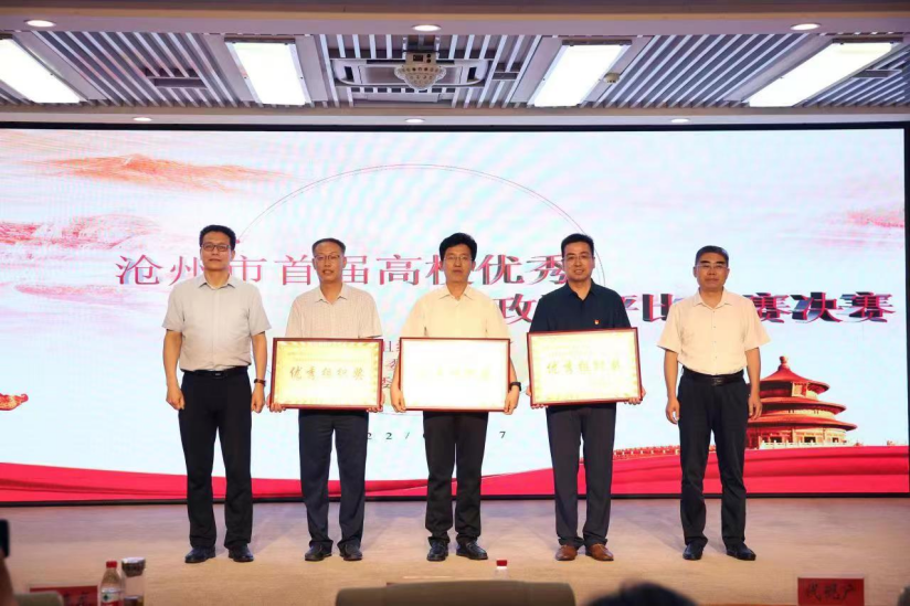 6月17日,由沧州市委宣传部、沧州市委教育工委联合举办的沧州市首届高校优秀思政课评比大赛决赛在沧州市图书馆负一层多功能厅举行,来自全市本专科院校的13名思政课教师同台竞技,充分展示我市优秀高校思政课教师的风采。赛前,省委宣传部思想政治工作研究会领导致辞,市委常委、宣传部长李凡同志作重要讲话。我校王国明副校长带队参加本次比赛,来自我校马克思主义学院的夏东昌、刘翠、刘琪3名老师经过校内初赛、全市复赛层层选拔,晋级本次决赛。