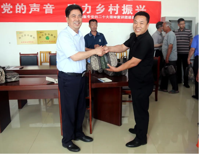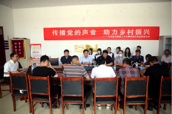 党的政策架桥梁,结对帮扶情意深;不忘初心再努力,乡村振兴启新程!为持续深入推进党的二十大精神走深走实,切实做好帮扶村巩固脱贫攻坚成果同乡村振兴的有效衔接,5月31日,学校党委副书记张中兴带领学校党员干部和马克思主义学院师生宣讲团一行到对口帮扶的海兴县张会亭镇小路村开展党的二十大精神宣讲活动,并进行走访调研慰问工作。驻村工作队、镇政府干部代表、村“两委”班子成员、 部分党员参加宣讲会。