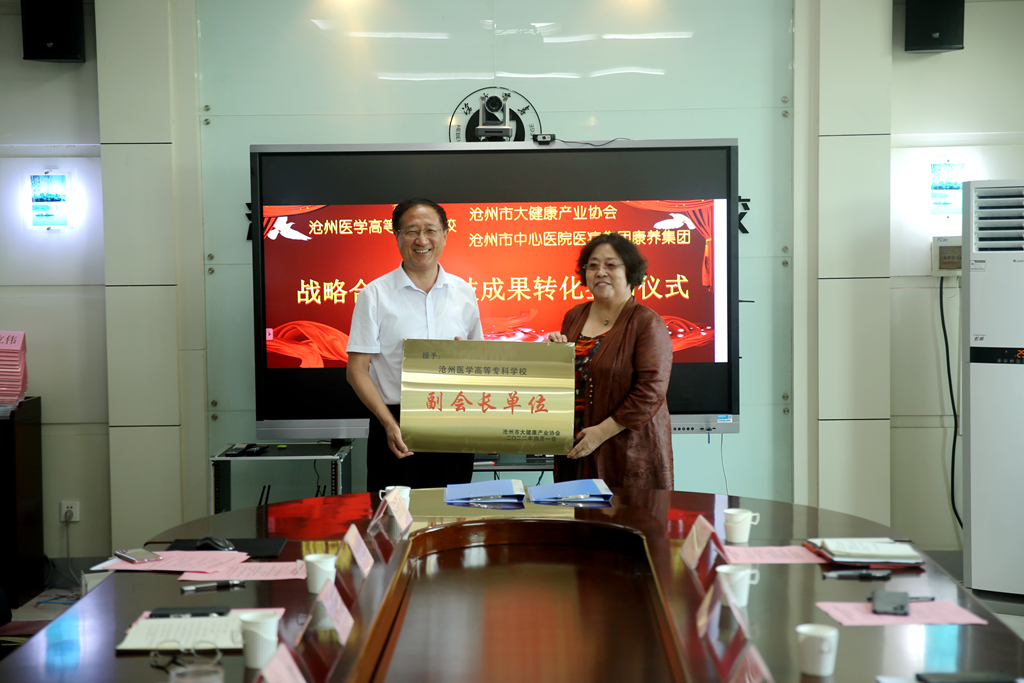 温秀玲向我校颁发“沧州市大健康产业协会副理事长单位”牌匾与聘书,刘健、张中兴分别接受牌匾和聘书。