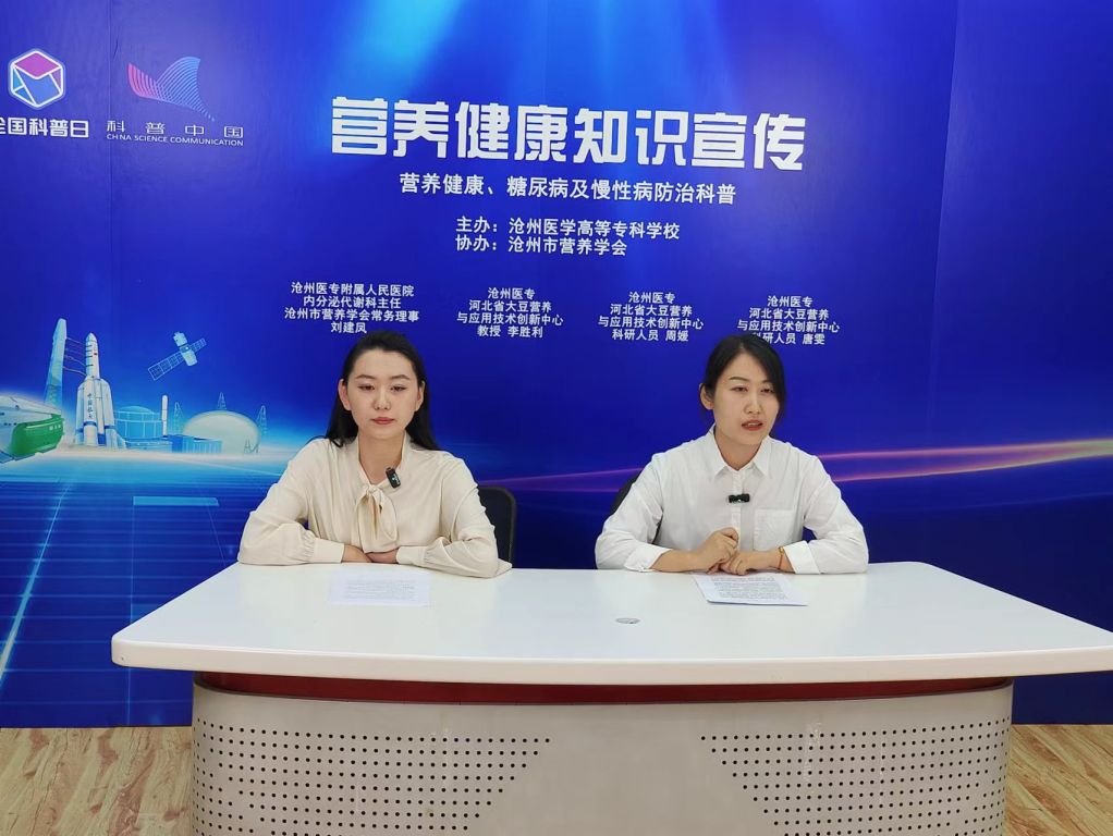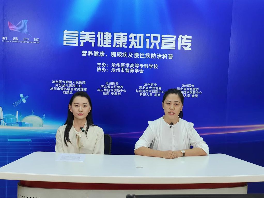 直播邀请到沧州医专附属人民医院内分泌代谢科主任、沧州市营养学会常务理事刘建凤,沧州医专“河北省大豆营养与应用技术创新中心”首席专家李胜利教授以及中心科研人员周媛、唐雯,他们分别以“糖尿病的预防”“双蛋白食品简介”“食品添加剂”“科学补钙”为主题进行科普。“越甜的水果含糖量越高吗?运动强度越大越能降糖吗?当两种优质蛋白结合,会有什么惊人的反应?最经济实惠的补钙方式是什么?食品添加剂到底是天使还是魔鬼......在一个多小时的直播时间里,四位嘉宾用通俗易懂的语言、贴近生活的实例,为大家奉上了一堂精彩的科普讲座,对帮助大家树立健康观念、增强健康意识具有很强的实用性和指导性。