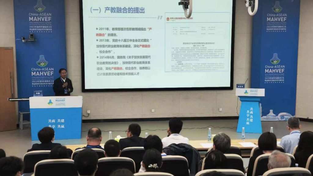 我校党委书记刘健受邀出席2023年面向东盟医药卫生职业教育交流合作学术研讨会,主持国际学术交流环节专题报告会,并在大会平行论坛——“大健康产业、急救教育与乡村卫生人才培养东西对接合作研讨会”上作题为《解读行业产教融合共同体——以康养行业共同体为例》的主题报告。