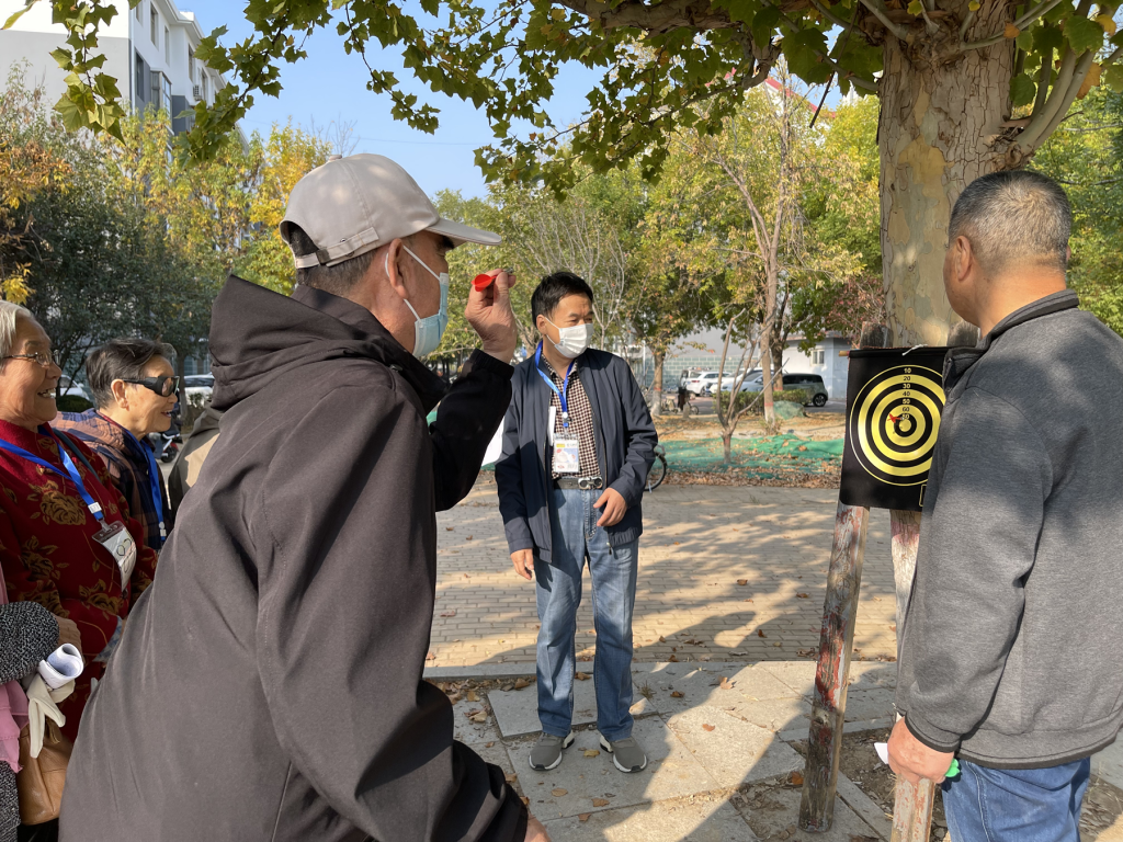 上午9点整,我校党委副书记张中兴、组宣部副部长邵路才准时来到小广场,与百余名离退休老同志共享秋日阳光,一同强身健体。陪同老同志们围绕小广场进行健步热身后,邵路才副部长宣布比赛正式开始。此次趣味运动会秉承“趣味为主,安全第一”的原则,根据老年人身体特点,设置了投飞镖、投沙包、指压板、赶小猪等竞赛项目。老同志们精神饱满,热情高涨,尽情投入到各类比赛中,准备、瞄准、投掷一气呵成,展现了活力满满、老当益壮的“精气神”和“年轻态”,热闹非凡的小广场上充满了欢声笑语。比赛设一二三等奖和纪念奖,运动会结束后,老干部科工作人员为选手们颁发了奖品。