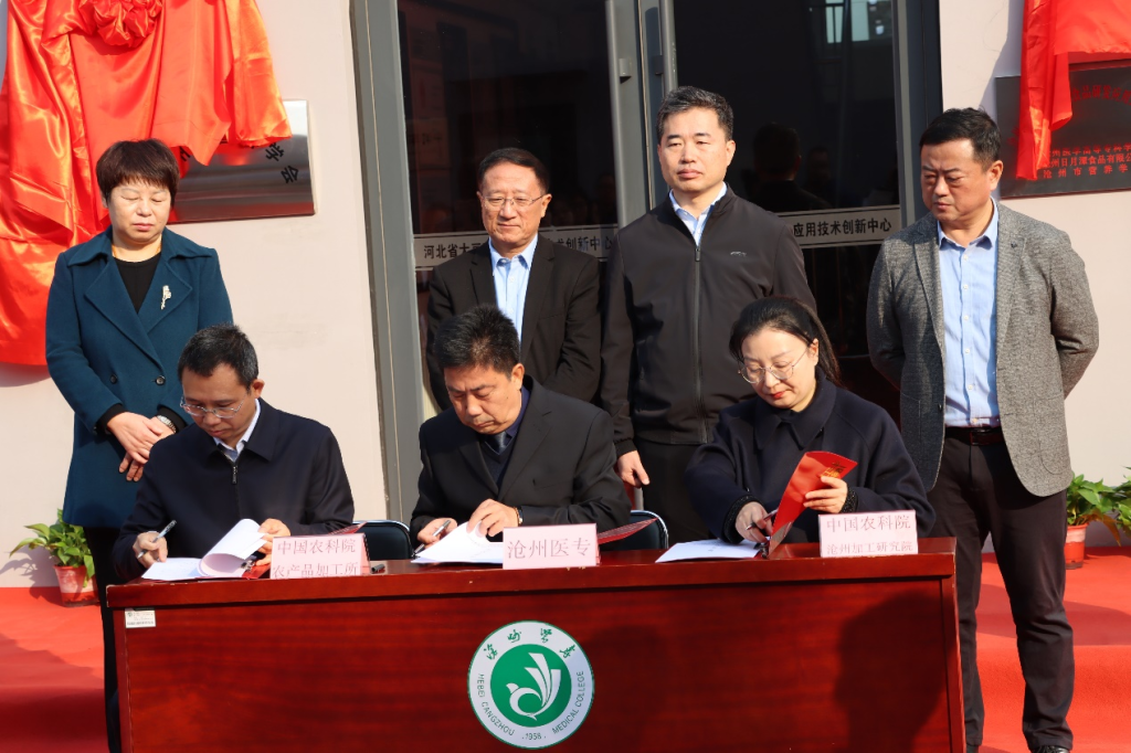 强强联合,双向赋能。揭牌仪式上,沧州医专、中国农业科学院农产品加工研究所、中国农业科学院农产品加工与营养健康研究院共同签订战略合作协议。根据协议,三方将充分发挥资源优势,在科学研究、项目申报、人才交流、成果转化等方面展开深度合作,共促产教融合发展,助力区域经济社会高质量发展。