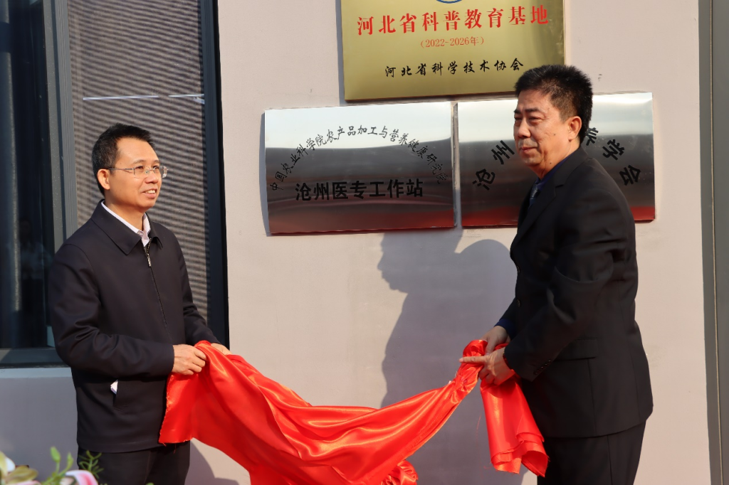 沧州市科技局党组书记、局长桑金歌与我校党委书记刘健共同为“河北省大豆营养与应用技术创新中心”揭牌。沧州市科协副主席王秀红与我校副校长王衍共同为“河北省科普教育基地”揭牌。中国农业科学院农产品加工研究所党委副书记、纪委书记邓红亮与我校党委副书记张中兴共同为“中国农业科学院农产品加工与营养健康研究院沧州医专工作站”揭牌。两个项目将依托省创新中心开展高质量健康知识普及与推广,项目研发与成果转化等工作。
