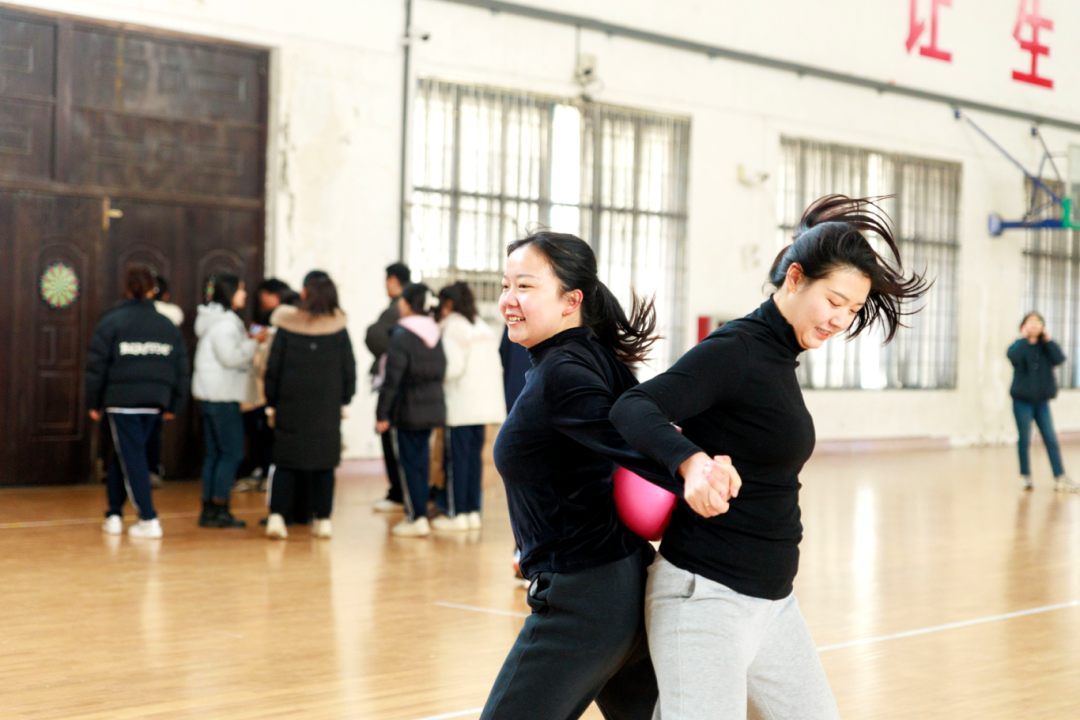 “我们背对背拥抱,不让皮球轻易滑掉~”,老师们两两组合,背对背夹紧皮球,步调一致地向终点靠近,游戏中,有的小组虽然出现一些小插曲,但老师们都能迅速调整状态,圆满完成比赛。她们就像回归童年的孩子,欢笑着、跳跃着,尽享运动好时光。