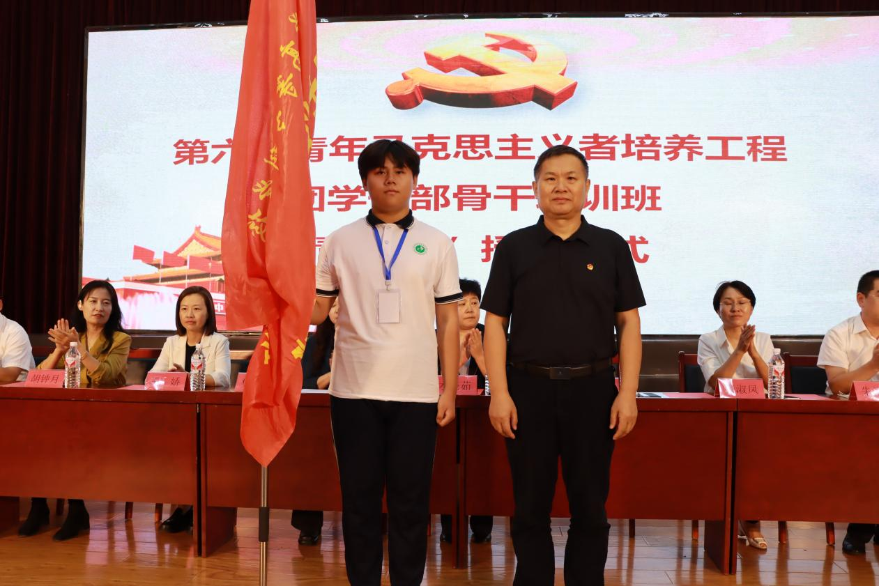 青春向党,逐梦前行。学校党委委员、副校长李炳仁为“青马班”学员代表授“青马旗”。