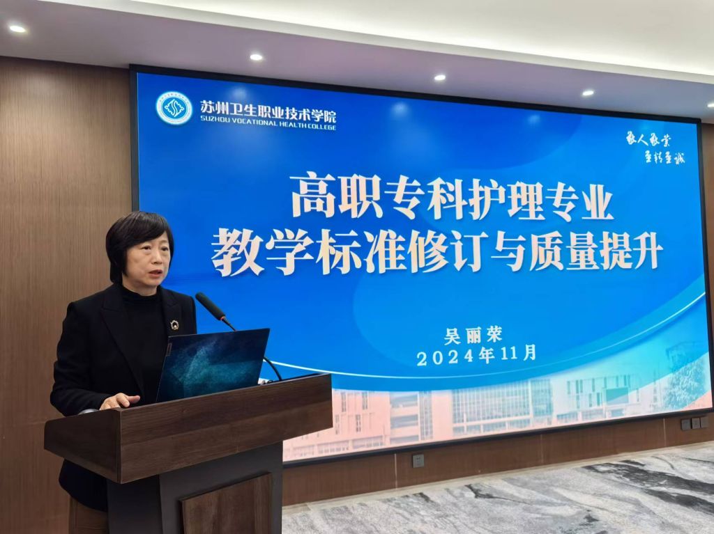 苏州卫生职业技术学院副院长吴丽荣教授作“高职专科护理专业教学标准修订与质量提升”专题报告,对高职专科护理专业教学标准修订背景、原因、要求等方面进行说明。苏州卫生职业技术学院护理学院副院长朱芬芬教授对课程标准制定说明要求进行了详细解读并提出了工作建议。