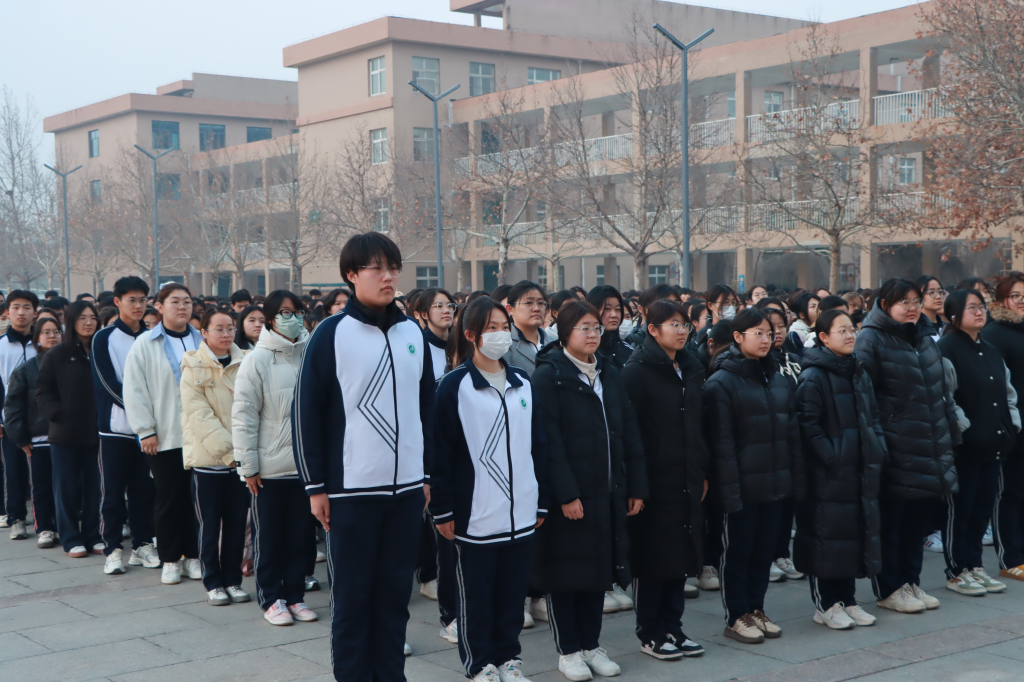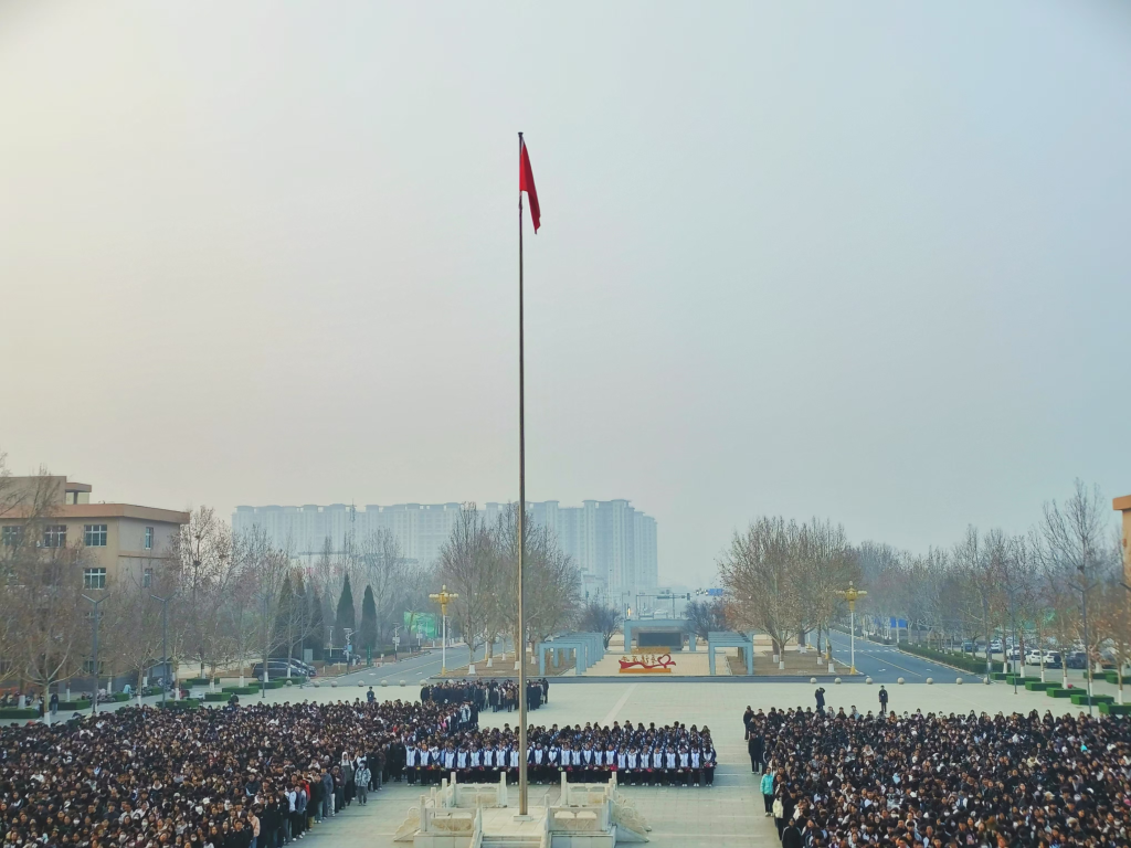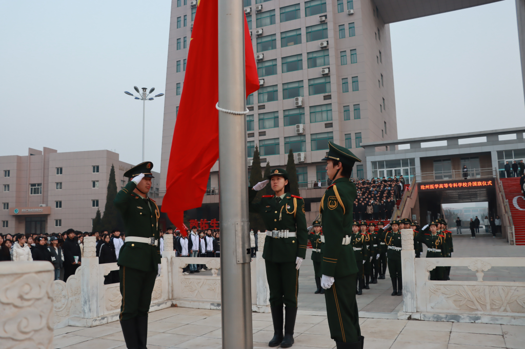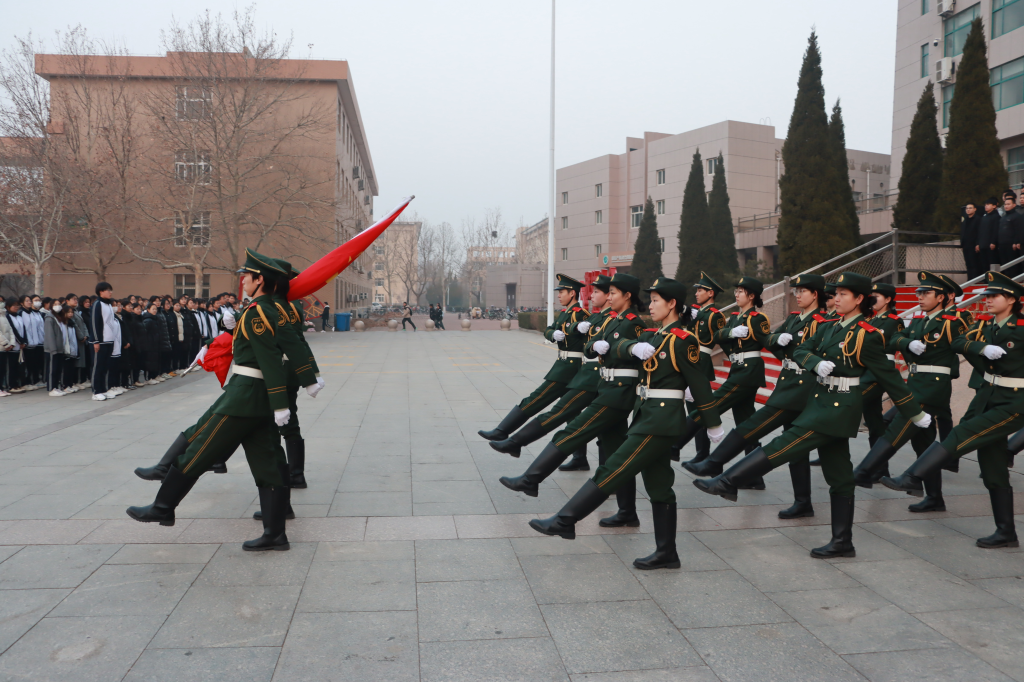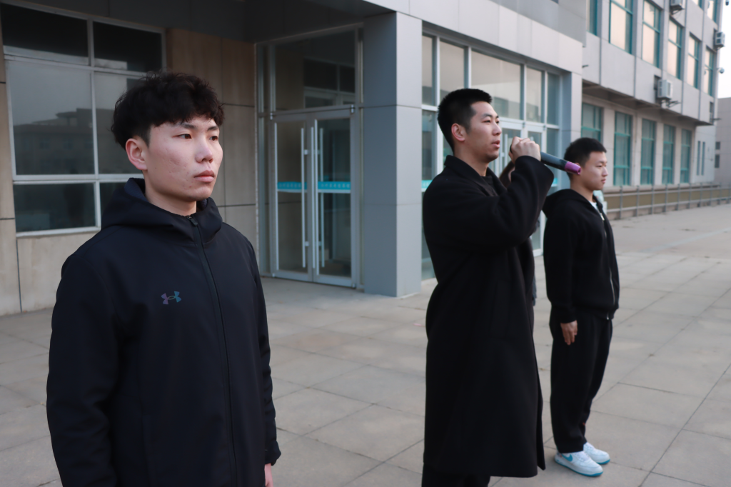 军绿方阵硬核护旗,伴随着雄壮激昂的《义勇军进行曲》,鲜艳的五星红旗伴着朝阳冉冉升起,迎风飘扬。全体师生庄严肃立,齐唱国歌,表达对伟大祖国的无限热爱和崇高敬意。