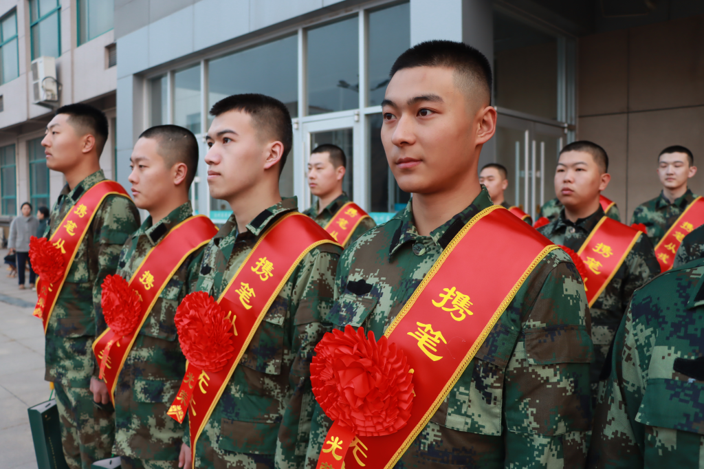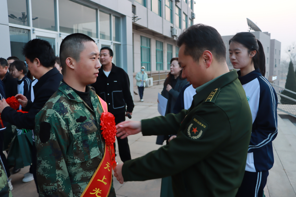 “始终把强国志、报国行写入基因序列!”随后,军、校领导为31名预定新兵佩戴大红花,并送上诚挚的祝福。