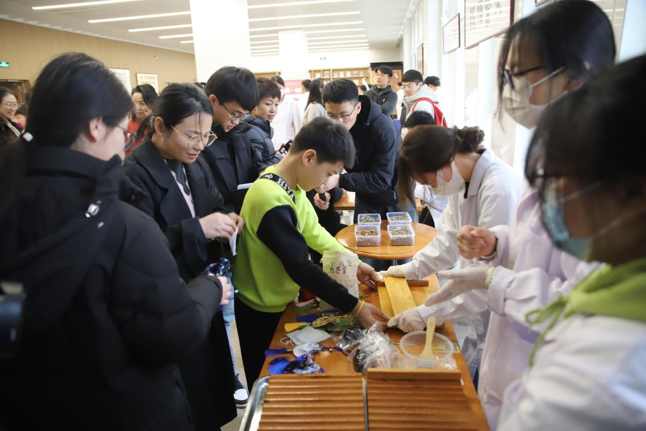 在中医药文化体验环节,开展古法搓丸、香囊制作等活动。