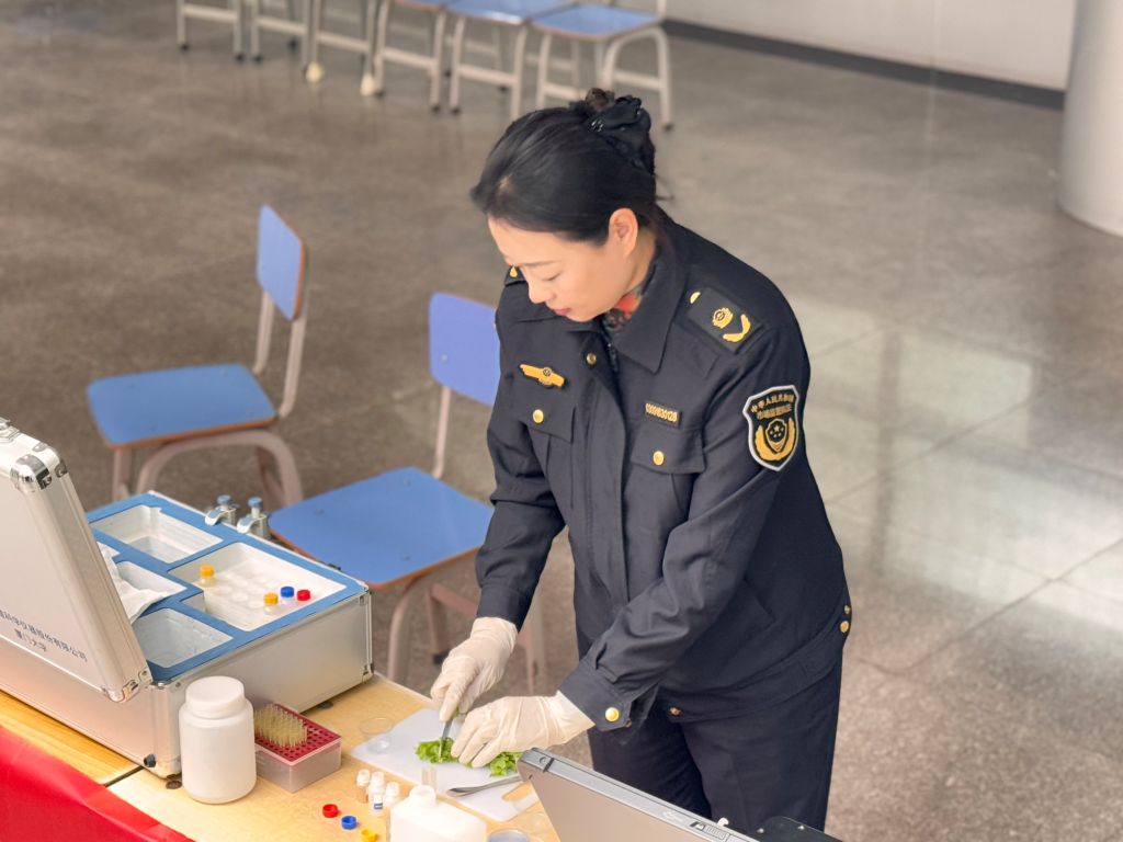 现场抽检环节,工作人员对食堂后厨的土豆、茄子、生菜等食材进行快速检测,并邀请学生参与操作读数仪,直观了解检测原理。检测结果实时公示,所有样品均符合国家标准。