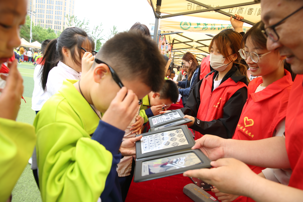 医学技术系师生带领孩子们走进视觉奥秘世界,通过色盲图谱、立体视觉检测图等工具,让他们了解眼睛如何感知色彩与空间。最受欢迎的莫过于立体视觉测试环节,当老师发放特制的红蓝3D眼镜后,孩子们迫不及待地对着立体视检测图集开始“寻宝”。“哇!这只苍蝇变立体了!”“老师,我摸不到它,但它真的在我眼前!”医学技术系的师生趁机讲解了双眼视差的科学原理:“我们两只眼睛看到的角度略有不同,大脑把这两个画面合成,就产生了立体感。”这场寓教于乐的视觉探索,不仅点燃了孩子们的科学好奇心,更在他们心中种下了爱护眼睛的种子。