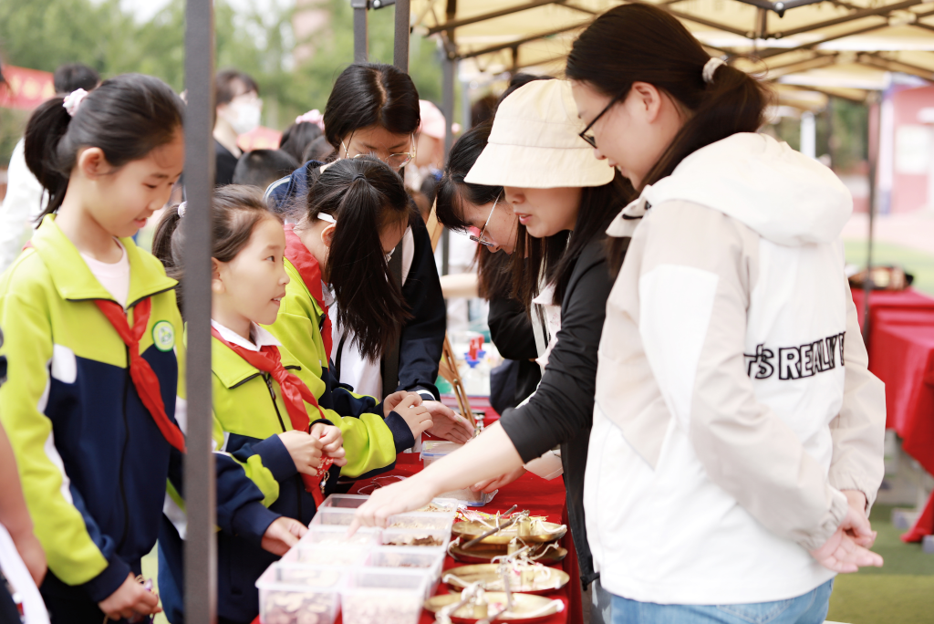 健康管理与服务系老师将劳动教育与自然美育结合,指导小学生用紫甘蓝、桑葚等天然材料制作“草木蛋”,在敲染过程中学习植物色素与酸碱反应原理。“小小营养师”们在大学生志愿者指导下开始了创作,先用纱布将花瓣、叶片贴在鸡蛋上,再用洋葱皮、红茶等天然材料染色。洁白的蛋壳上清晰地印着花瓣的轮廓,宛如精致的浮雕艺术品,引发阵阵惊叹。每个孩子都获得了精心包装的“草木蛋”,并且学习了关于鸡蛋的营养知识,了解了“蛋清富含优质蛋白,蛋黄里有聪明的卵磷脂”的道理。