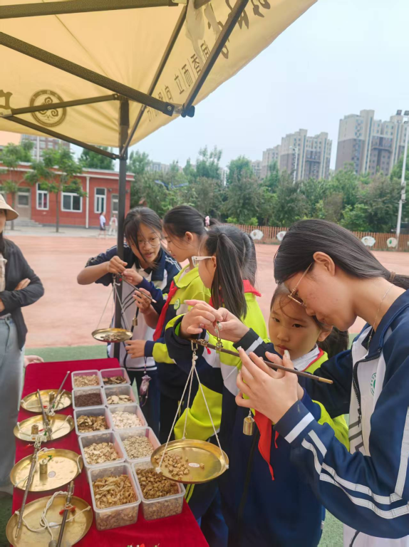 中医药系的展台前弥漫着草药清香,孩子们好奇地掂量手工秤,辨识板蓝根、决明子等常见药材。他们化身“小小药师”,左手扶秤杆,右手拨秤砣,屏息凝神,尝试将中药准确称出。同学们兴奋地说:“原来抓药这么讲究,多一分少一分都不行!”中医药系师生通过“穴位藏宝图”让孩子们了解身体的秘密开关,“同学们知道吗?我们的身体就像一张藏宝图,上面有很多神奇的开关!”老师举起一个人体穴位模型,立即吸引了所有孩子的目光。孩子们在老师的指导下寻找自己身体上的不同穴位,并且两两一组,体验穴位按摩。