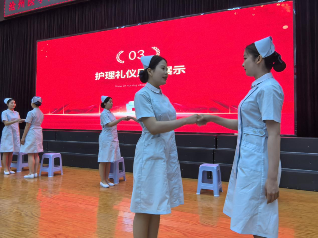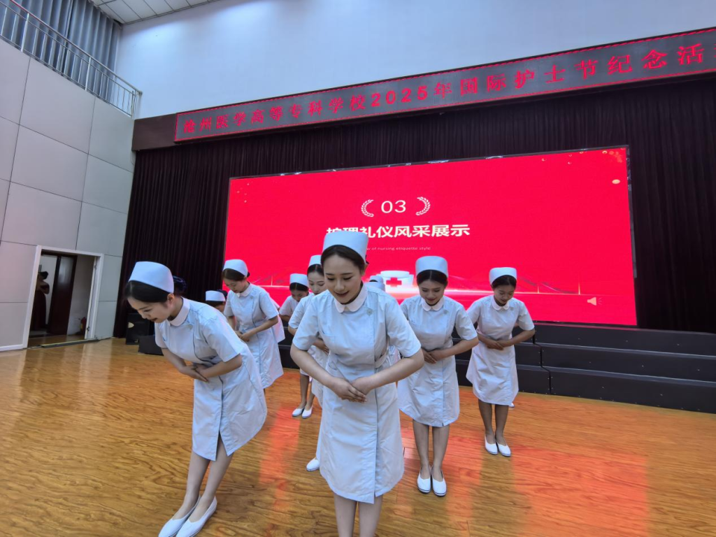 护理学子们身着整洁的护士服,以一场别开生面的护理礼仪风采展示,生动诠释了白衣天使的职业魅力。从端庄的站姿到优雅的行姿,每一个动作都既体现了护理工作的严谨性,又展现了护理人温暖的人文关怀。她们的表演如行云流水,将护理礼仪的艺术性与专业性完美结合,让观众深刻感受到护理不仅是技术,更是一门传递温度的艺术。