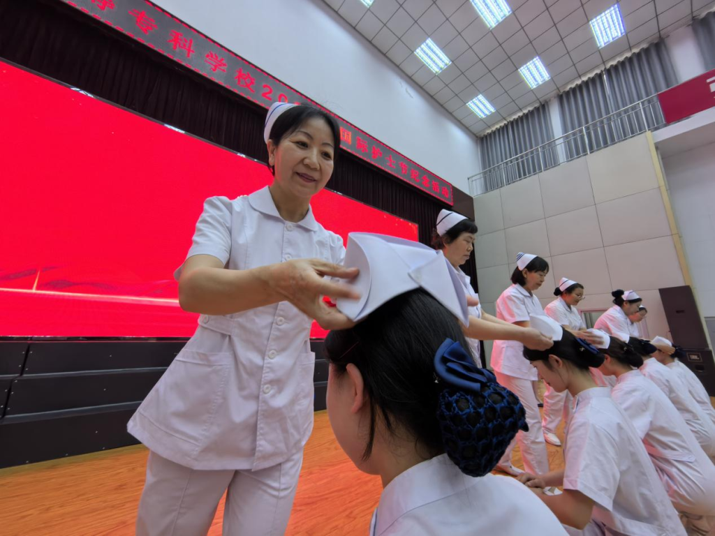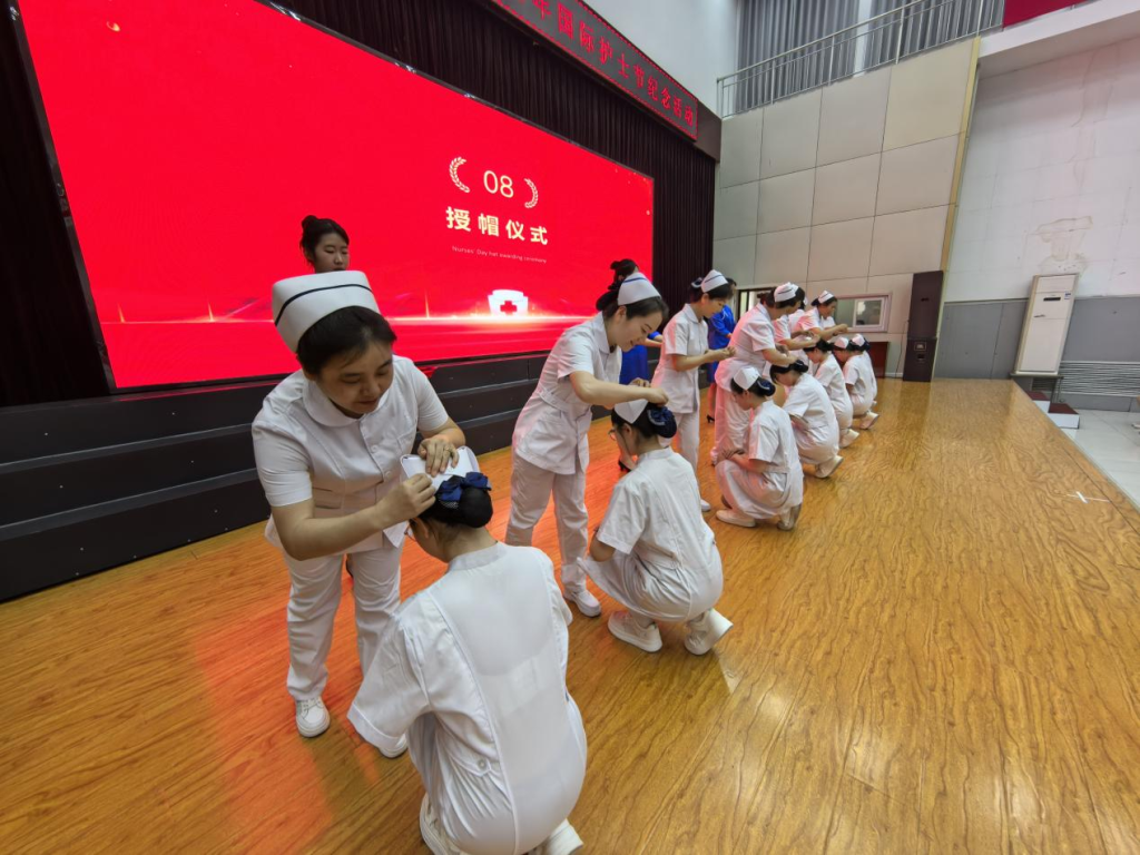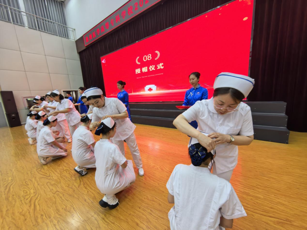护理教师为学生代表戴上圣洁的燕帽,每一顶燕尾帽的佩戴都伴随着温暖的微笑和期许的目光,这一刻,不仅是职业身份的授予,更是护理职业精神的代代相传。