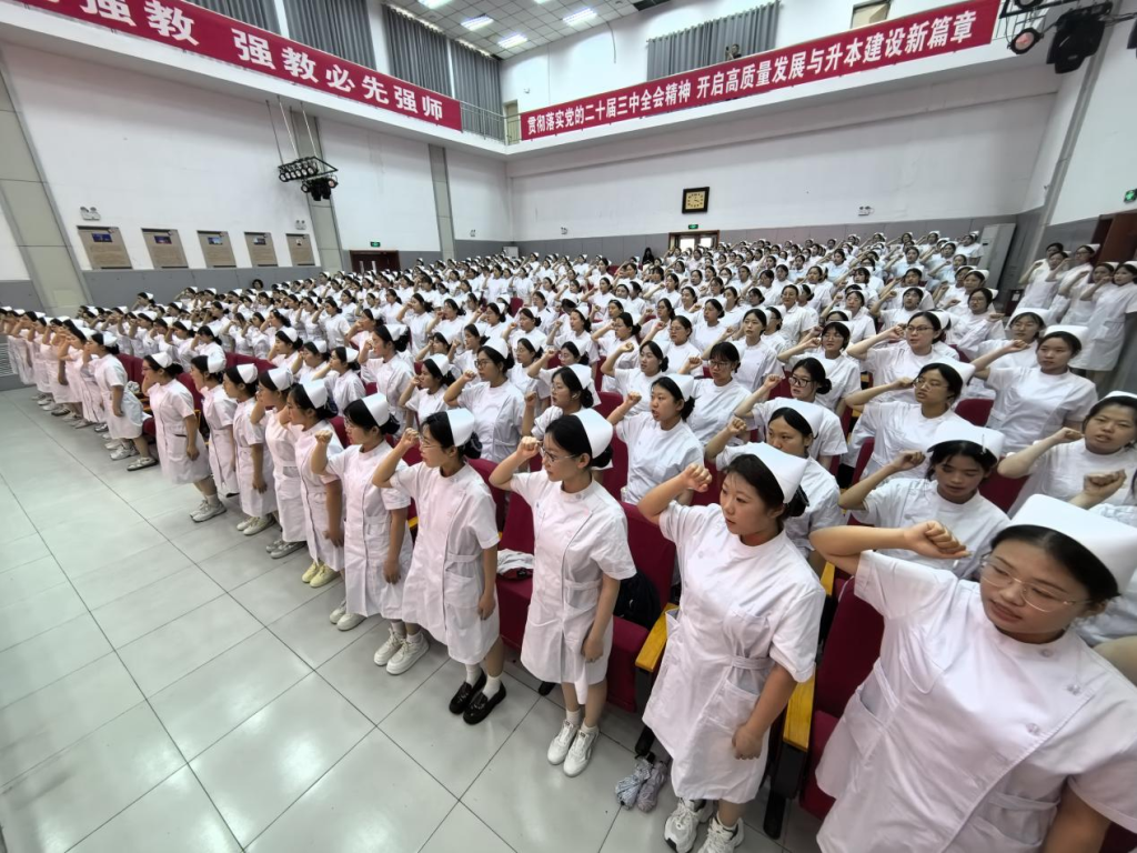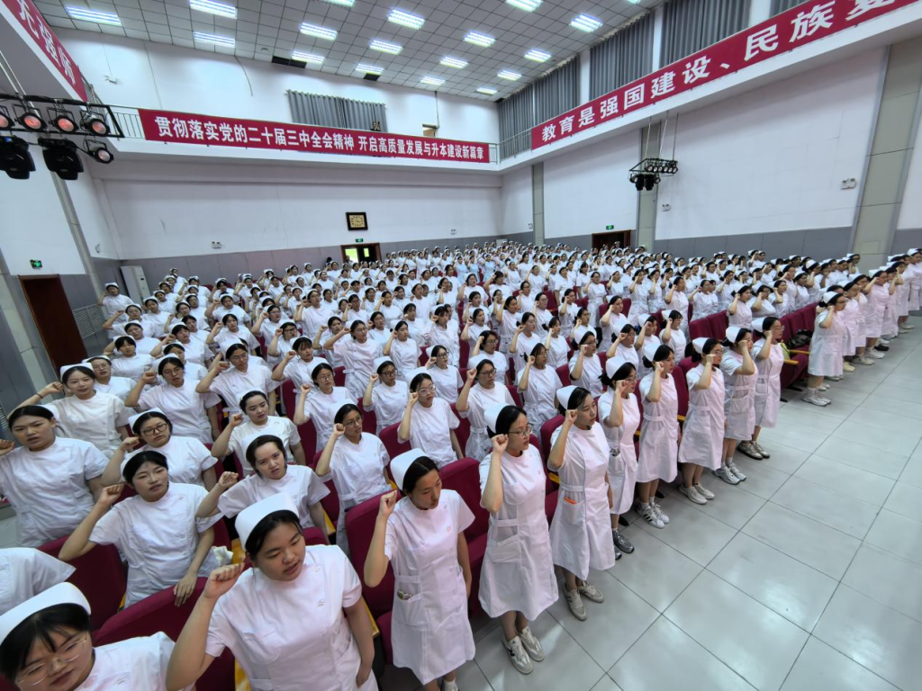 全体学生代表在董楠老师的领誓下庄严宣誓,铿锵誓言回荡全场,彰显了护理人的坚定信念与崇高追求。