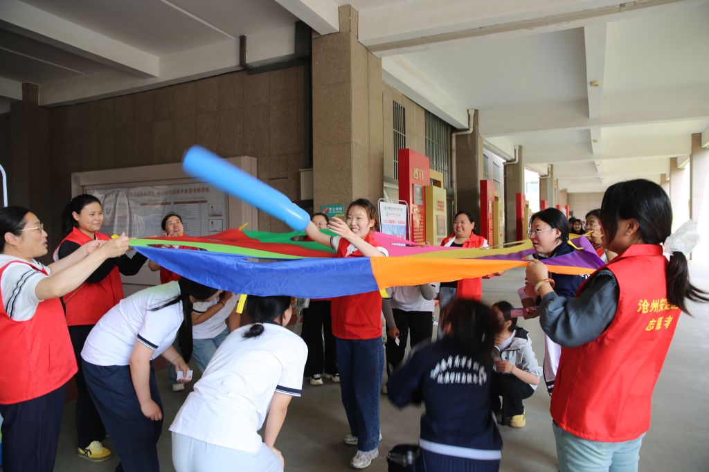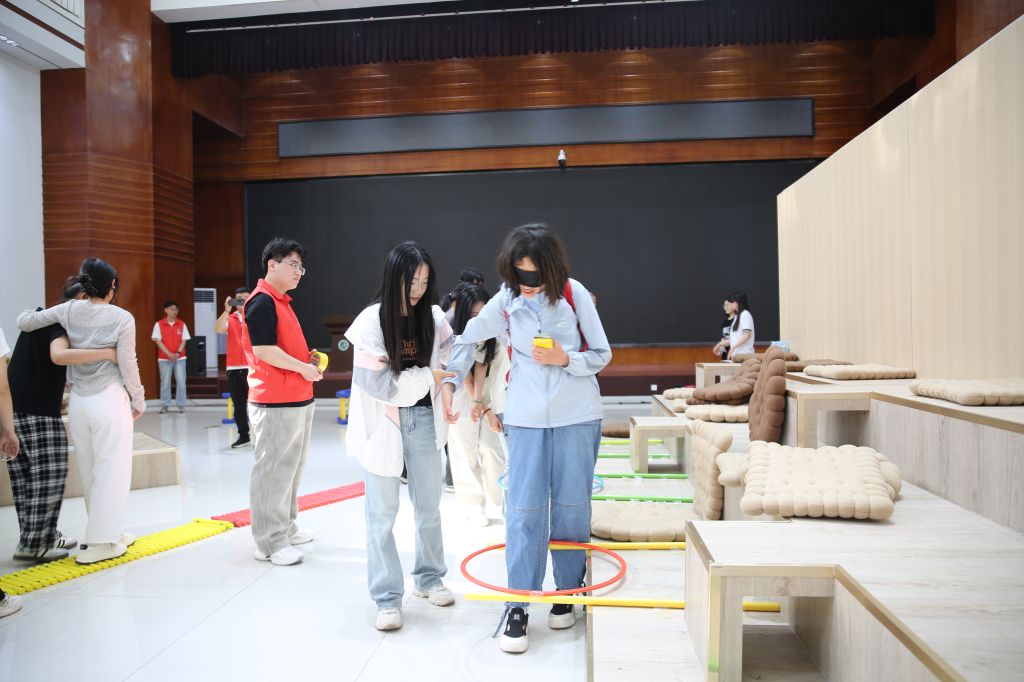 揭幕仪式后,“心理游园会”热闹开场。各大互动活动区人气爆棚,瞬间成为欢乐的海洋。在“抱抱任务区”,师生通过肢体接触传递温暖关怀;在“夸夸镜”前定格自信笑容;在“信息传递组”体会非暴力沟通的魅力;在“盲行组”中感悟信任的力量;在“鼓圈疗愈”里感受团队协作的共鸣。这种沉浸式体验设计,让心理健康知识真正“入脑入心”。