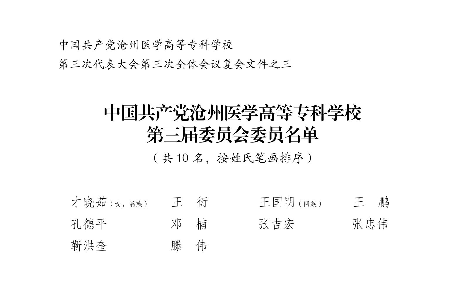 才晓茹号召,新一届党委要始终在思想上、政治上、行动上同以习近平同志为核心的党中央保持高度一致,以习近平新时代中国特色社会主义思想统领学校一切工作;要以强校升本为总抓手,继续发扬沧医创业精神,用逢山开路的勇气破解转型难题,用久久为功的韧劲推进工作任务;要始终把师生利益放在首位,把“学生成长成才、教师安居乐业”作为工作的出发点和落脚点;要坚守清正廉洁的政治本色,严于律己、慎独慎微,做师生信赖的“贴心人”;要主动融入国际职业教育发展格局,借力“扁鹊学院”等平台提升办学影响力,奋力把学校建设成为特色鲜明的医学本科院校,为健康中国建设贡献更大力量!