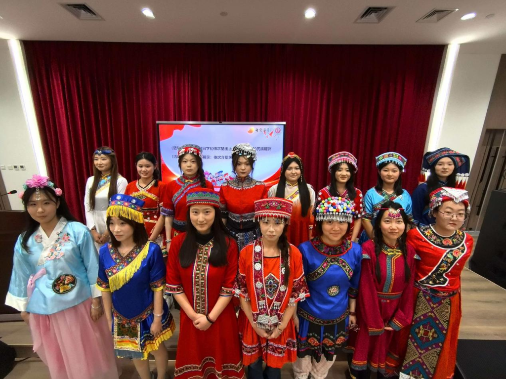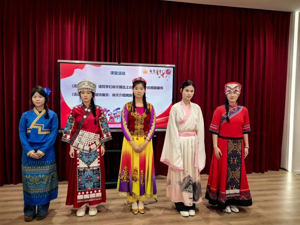 课堂的高潮,在身着 56 个民族传统服饰的同学们的惊艳亮相中到来。5位民族服饰代表同学率先登台,以趣味竞猜点燃全场热情;随后,51位身着不同民族服装的同学依次走上台前,以清脆的声音诉说民族身份,以绚丽的服饰展现独特的民族风情。蒙古族的豪迈奔放、苗族的灵动秀美、维吾尔族的绚丽多姿、藏族的庄重典雅......一幅幅多彩的民族文化画卷在课堂徐徐展开,让同学们近距离感受各民族文化的独特魅力,深刻体悟“56个民族56朵花,56族兄弟姐妹是一家”的温暖内涵,更让“石榴籽紧紧抱在一起”的理念深植于心。