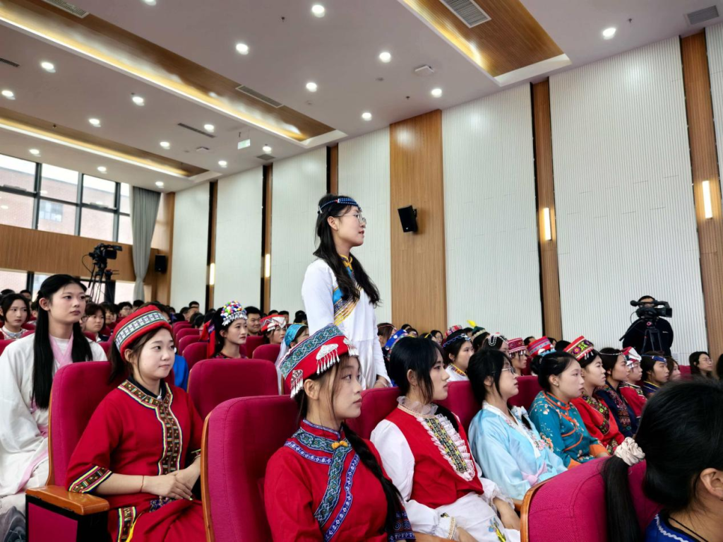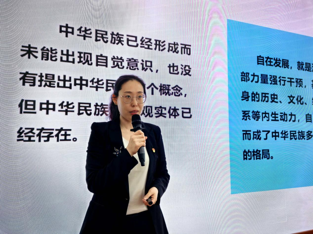 “中华民族是1个民族还是56个民族?”一句亲切提问,引发全场热烈思考。才晓茹教授回应大家:我们从不是在“1”与“56”间做选择,而是56个民族手拉手、心贴心,凝聚成一个中华民族。质朴的话语,让共同体理念深深扎根在每一位学子心中。