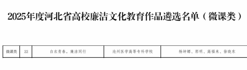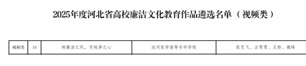 医学技术系党总支选送的视频类《树廉洁之风,守纯净之心》、医学系党总支选送的微课类《白衣青春,廉洁同行》、学校党委、学校纪委共同撰写的实践案例《“四廉诊脉、四看询证”纪检“爱廉坊治未病”廉洁教育创新实践》三个作品入选河北省教育厅遴选名单。
